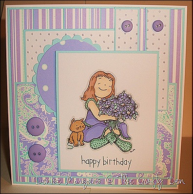 Now it was a difficult decision to decide which one to have as they are all so cute but I plumped for ‘Maisy sitting with Kaboodle’ and coloured it with my promarkers (adding stickles to the centres of the flowers). The papers are all making memories from the ‘Meg’ paper pack and the plain card is from the papermill shop. I used my swiss dots embossing folder in the CB and ran a colorbox cats eye chalk inkpad over the top to highlight the embossing. I cut out the circle with my nesties and the buttons are doodlebug. The sentiment is a rub-on by pebbles inc.