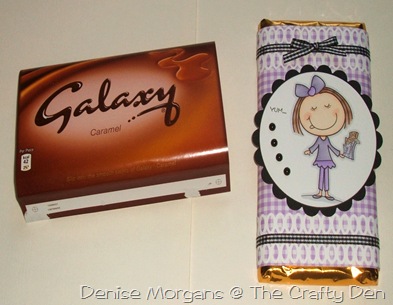 Welcome back to my little corner of blogland! I’m here again to share with you my DT project for this week’s cupcake craft challenge. Our theme this week has been set by the lovely Victoria and she has chosen “sweet treats” with the option of halloween if you like. Now as I mentioned in yesterday’s post I’m all halloween’d out so my project is for a friend’s birthday which is coming up soon. I decided to make a card and matching candy wrapper – here it is (sorry I’ve gone a bit nuts with the pics today):